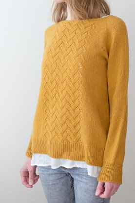 Beautiful top down sweater with lace panel on front. The sweater is worked seamlessly in the round. The neck is shaped with short rows and the body has a slight A-shape. The pattern also includes a photo tutorial for German short rows. Please note that the lace panel is charted only.