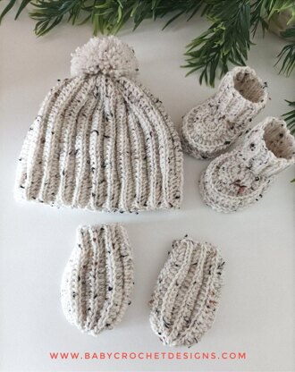 This set has a Beanie in sizes preemie to adult, Booties (in baby sizes) and Mittens (sizes preemie to adult).