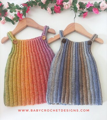 This cute ribbed pinafore dress is made with two panels then joining together down the sides. Using a simple single and half double crochet in the back loops which creates a lovely texture.
