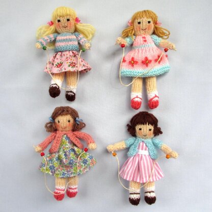 We all have happy memories of skipping during the summer months. Each little girl in her pretty summer outfit has a skipping rope and is easy to make from odds and ends of yarn. Hayfield Bonus DK (colour Flesh Tone) is recommended for the dolls' heads, arms and legs. The tiny skirt and dresses require only small pieces of cotton fabric. Quick to make these little dolls make excellent fund raisers at fairs and bazaars.