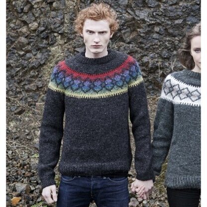 A rainbow of colorways with classic Icelandic stranding create this warm and exciting Seigla pullover. Knit in seamlessly in the round from the bottom up, the body and sleeves are joined at the unerarms to work the yoke as one piece. This pattern is also available in a women’s cut. Colorwork patterns are charted only.