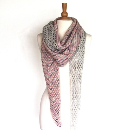Be still my heart. Lovella has all the suggestions of a lacy valentine. With contrasting colours in garter row stripes and a delightfully simple section of eyelet, it forms a substantial shawl that curves like an embrace around the shoulders. This charming design in DK weight yarn is quick to knit and begs to be cast on more than once. Knit one for yourself in your favorite colours, then make another for a loved one, tie it up with a ribbon, and send it as a hug.