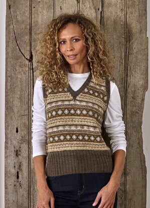 Lowlands sweater vest is a classic v neck Fair Isle style vest, knitted bottom up seamlessly in the round to the underarm where steek sts are added to fill the gaps at the neck and armholes and avoid having to work any colourwork back and forth in rows. Shoulders are joined with a 3-needle cast off and the steeks are stabilised with crochet chains and cut open before sts are picked up around the armhole and neckline for ribbed trims. The v neck trim features a mitred decrease finish.