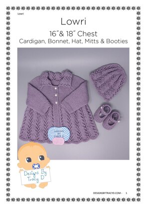 Lowri is a Baby Knitting Pattern for a matinee coat, Hat, Mitts, shoes and booties to fit a baby 16" and 18" chest using DK yarn and 4mm needles. The mitts and booties are not shown on the pattern.