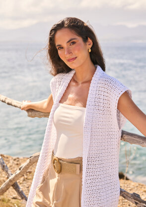 Lumiere is an elegant summer waistcoat, crochet from Cotton DK. This full length piece which is worked widthways is designed for wearing as a summer cover up for the beach or pool or as a stand alone sleevelesss cardigan for an elevated look.