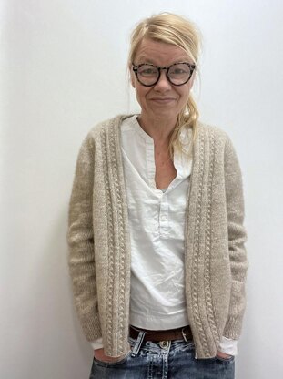 Mabel is an open front cardigan. It is worked seamlessly from the top down using the contiguous set-in sleeve method (developed by Susie Myers) to shape the shoulders and sleeve caps. Knitting starts with the back part of the neckband/collar. Stitches are then picked up from the long edge of the neckband. Increases are worked on both RS and WS rows to the final shoulder width, then the sleeve caps are worked simultaneously with the front neck shaping to sleeve separation. The body is then worked top down to the bottom ribbing. Sleeves are also worked top down, in rounds.