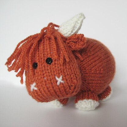Mac is a cuddly Highland bull with a floppy fringe. Techniques used in this pattern include knitting loops, and simple increases and decreases for shaping. Designed by Amanda Berry @fluffandfuzz, Mac is knitted in acrylic DK yarns on single pointed needles (not in the round). For confident beginners and above, other techniques used include casting on and off, knits, purls, increases and decreases, and seaming to finish.