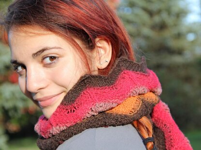 Magmatic is worked in an elongated chevron stitch (with optional beads) in the round, and then steeked to turn it into a scarf. Fringe is then "self-made" by unraveling stitches at each end of the scarf.