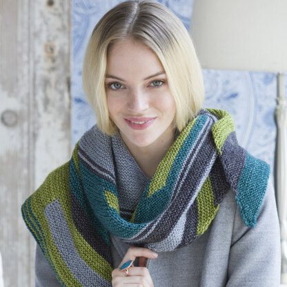 Malabrigo Chatham designed by Matthew Schrank has stripes that are knit in two directions and on the diagonal with either full-on stripes or stop and start color blocks in this drapey bias garter wrap scarf. This fun and colorful accessory is knit in Malabrigo Dos Tierras a yummy and squishy Merino and alpaca blend.