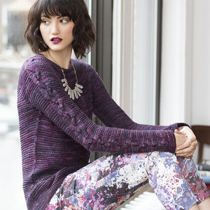 Knit from the top down in Malarbigo Rios, Empire is a flattering round-yoke pullover. Two cables twine up the sleeves of this elegantly simple sweater worked in garter stitch.