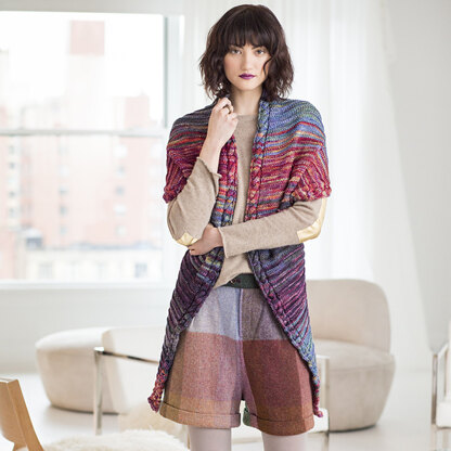 Malabrigo’s Gallery Row is short sleeved jacket knit in Rios, a fabulous, hand-dyed, worsted weight yarn. This simple design is knit flat in one long rectangle and seamed at the end. A cable adorns the edges, and stripes of four different shades create a veritable rainbow of colors.
