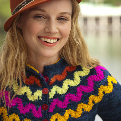 A colorful zigzag pattern adorns the yoke of the Pinebank cardigan from Malabrigo. This cheerful sweater is knit from the top down in Malabrigo Worsted, an incredibly soft, hand-dyed Merino wool yarn.