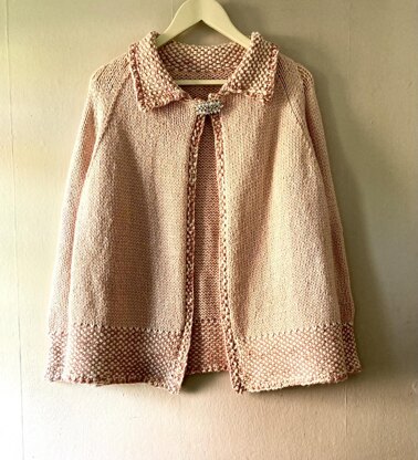 A simple vintage inspired edge to edge cardigan made using a chunky weight yarn, it features raglan sleeves and a pretty two colour moss stitch hem, cuff and collar; which adds a lovely texture to the finished cardigan.