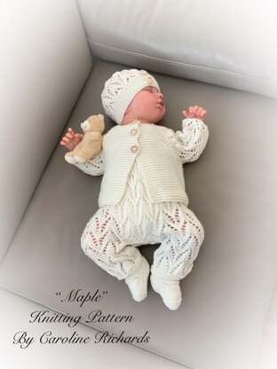 A pretty knitting pattern that provides the instructions to make all 4 pieces of this set, The cardigan, Trousers and hat are all knitted from the top-down, with line by line instructions making this set easy to knit.