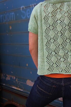 Margarita is an easy, toss-on cardigan for summer. Bold lace on the back is echoed in the lace detail that finishes the ribbed collar. A casual length and short sleeves make this perfect over a sundress or shorts. The fit is open, with narrow front panels meant to showcase what's underneath, but directions are included to make the fit more traditional if you prefer a more closed silhouette. Choose the size that gives you about 2” of negative ease, based on bust size, for the fit shown. Sizing is given for actual finished garment measurements. Modified shaping options allow you to add 4, 4.5, or 6” to this measurement. Revise yarn quantities if you use modified shaping. The yarn I used is a lovely wool and cotton mix from O-Wool in Peridot. It hits that delicate balance of light, soft, warm and just a touch rustic, making Margarita feminine, but not too girly. Alternatives yarns are suggested but always check your gauge.