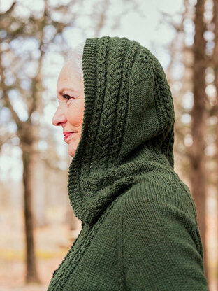 Pockets are just the beginning of the things to love about this hooded cardigan! It’s worked seamlessly from the top of the hood down with raglan shaping. Gorgeous cable columns frame every edge and adorn the center back for refined focal points.
