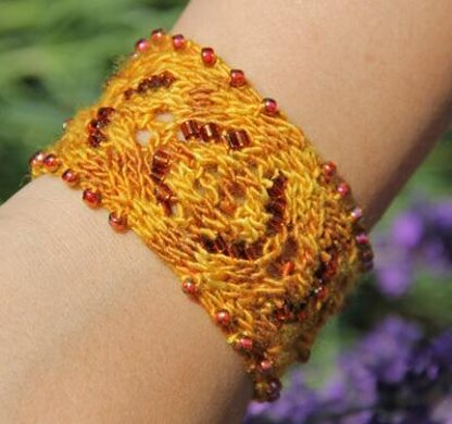 Medallion is worked in two halves and grafted at the center. The bottom edge creates gentle scallops that provide anchor points for the clasps. Beads slipped up at the sides of the wrong side rows accentuate the edging and beaded yarnovers add a bit of sparkle to your knitted wardrobe. Medallion is also July's pattern in Adorn Anew.