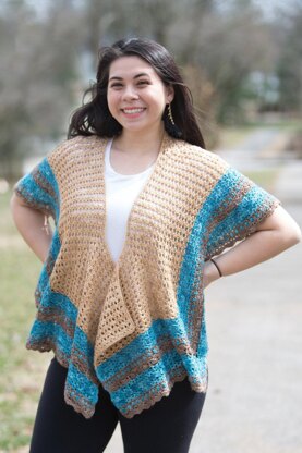 A five-sided open square creates the generous drape of this season-spanning wrap. The extra side means that it wraps securely and stays in place. How many different ways can you style it? Choose your favorite three colors of fingering weight yarn, or go for broke with a novel color combination as shown here. Be sure to save a few yards of each color for the final selvedge edging.