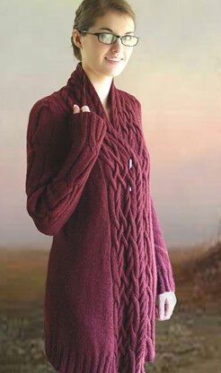 Open-front cardigan with back and bodice yokes, fabulously cabled shawl collar, more cabling down sleeves and with a flattering cabled lattice whittling the back waist.