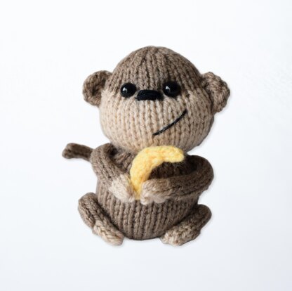 Micky the Monkey is having a banana snack! This is a pocket-sized toy you can carry with you on your adventures. Worked mostly in stockinette with increases and decreases for shaping, the face incorporates intarsia colour-work. Designed by Amanda Berry @fluffandfuzz, the monkey is knitted in acrylic DK yarns. The arms, legs, tail and banana are i-cord pieces worked on two DPNs, and the other pieces are knitted flat on single pointed needles (not in the round). For confident beginners and above, other techniques used include casting on and off, knits, purls, increases and decreases, and seaming to finish.