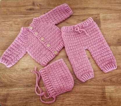 This cute little set of cardigan, jogging pants and bonnet are made using a simple dc and sc stitch (lemon peel stitch). They are quick and easy to work up. Then leg cuffs and waistband are made with a fpdc and bpdc.