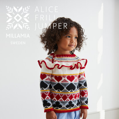 The MillaMia Alice Frill Jumper is a showstopping pullover that's perfect for kids with a flair for the fanciful. This Alice in Wonderland inspired sweater features stranded colorwork motifs of the suits of cards on the body and a whimsical waving ruffle circling the yoke. This sweater is knit flat in pieces from the bottom up with sleeves, front, and back joining to work the raglan yoke in one piece. The frill is knit flat separately and seamlessly joined into the yoke. A button placket along one raglan line makes for easy on and off and adds another splash of color. Colorwork patterns are charted only.