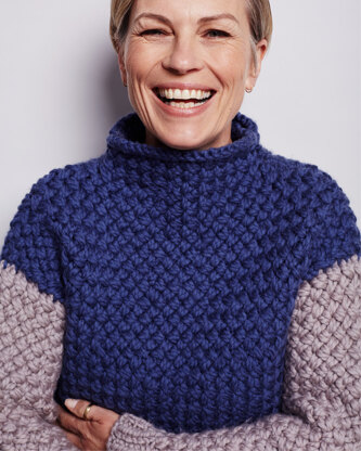 Tala Jumper from MillaMia is a lovely chunky women’s color-blocked pullover knit in Naturally Super Soft Chunky, a plump, plush Merino wool yarn available in a beautiful range of colors. This fun sweater is perfect for relaxing in and features an all-over textured pattern, dropped shoulders, and mocked turtleneck. Tala is knit flat from the bottom up and then seamed. The textured pattern is in written form only.
