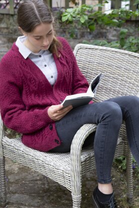 This great unisex V-neck ‘boyfriend’ cardigan (the women’s sizes are larger than usual) is knitted in Rowan Moordale yarn. The fronts feature varying sizes of plain and twisted cables; the back and sleeves are in a textured stitch pattern.