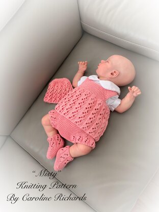 A pretty Tunic set, with matching knickers, hat, and booties. The pattern provides the instructions to make all 4 pieces of this set, The Tunic and hat are both knitted from the top-down, using straight needles, back and forth all with line-by-line instructions making this set easy to knit.