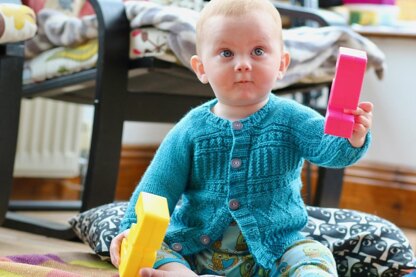A gansey pattern with a difference! The fun construction of this sweater turns the pattern stitches on their side. The cardigan is knit from each cuff in to the centre.