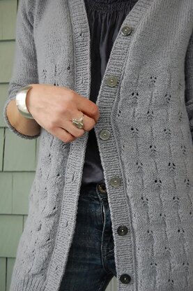 Moonshine is a versatile, feminine cardigan featuring a simple lace repeat which appears fluid when worked in a large panel. These waves of lace are subtly echoed in a slip stitch border along the front edges, which might be my favorite detail of the whole design. Worked in a delicate sport weight wool this cardigan is perfect for layering in cool or warm weather. As always, top down construction makes for a stress-free knit and the lace repeat is easy to memorize. Instructions are included in the pattern for altering either width or length to make this flattering for your shape. As written, there is 4" of ease through the bust, and the width in the lace portion is brought in a bit for a body skimming shape. Sleeves are fitted for a flattering silhouette and buttons can be placed wherever you like. The sample is pictured in Imperial Yarns, Tracie Too in the colour Rain. Alternative yarns are suggested but always check your gauge for a good match.
