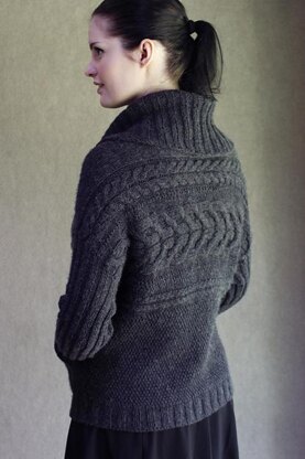 The pullover is knitted from side to side in one piece beginning with a provisional cast-on. Pockets are cleverly knit in. Cowl and ribbing at hem are picked up and knitted. Sleeves are knitted from the top in the round, and sleeve caps are shaped with short rows.