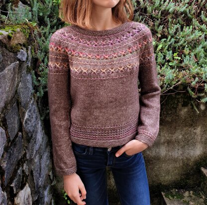 KALEIDOSCOPE Sweater is a seamless top-down sweater with round yoke featuring “lazy colorwork”, i.e. you always work with only one strand of yarn in a round, and the pattern on the yoke emerges due to slipped stitches.