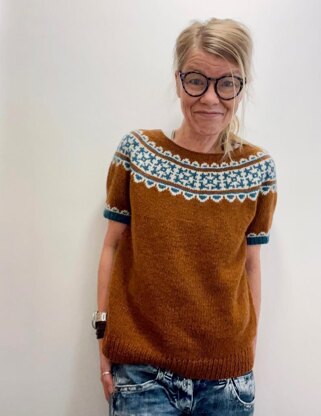 Nefeli is worked seamlessly from the top down. Starting with the neck shaping, short rows are worked back and forth to create a higher back neck. The yoke is then worked in the round to sleeve separation. Sleeve stitches are placed on hold to work the body top down. Sleeves are worked top down to the cuffs. Both the yoke and sleeve cuff colorwork include some rounds where you have to work with 3 colors. Optional neck finishing can be either worked at the start or worked last. Sample is worn with 5" (12.5 cm) positive ease at bust.
