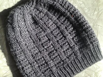 A long fitted hat with a fun and easy knit/purl texture pattern.