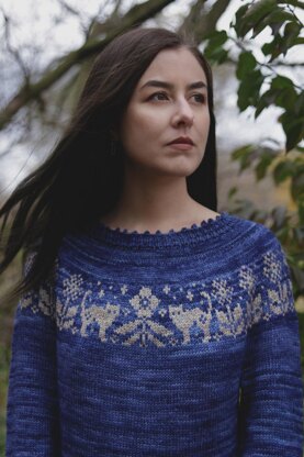 Knit the magical journey of Sachiko’s Night Blooms sweater, blending dark magic with a kooky twist. Inspired by dreams of moonlit walks, magical cats, stars and mystical flowers adorn the yoke of this sophisticated sweater with a picot neckline that flatters and elongates the neck. The Violet and Sand colourways of TYC’s Bloomsbury DK combine to create a playful knit that will transport you back to the magical world of the heady 90s.