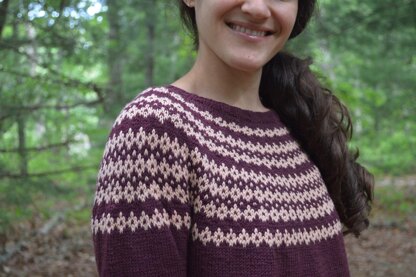 Nightshades is a sweet pullover featuring a simple colorwork yoke resembling chains of little nightshade flowers. The easy-to-memorize repeatable stitch pattern makes for enjoyable knitting. A great beginner pattern with only 2 colors worked in stranded colorwork, increases worked on solid rows, and no seaming required. Knit up in Brooklyn Tweed’s specialty Ranch 03 yarn, Nightshades is easy to substitute with a variety of sport-weight yarns on the market. The 3/4 length sleeves and light weight fabric makes Nightshades the perfect spring transitional sweater for mixing and matching with your wardrobe!