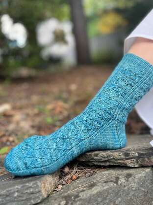 The tiny cables of these socks create an all-over interlacing texture. Knit cuff-down with a heel flap and gusset construction. Nodolini is Italian for “little knots.”