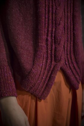 This gorgeous cabled sweater is seamless! The front and back panels are worked separately to the neck, then joined. Then the collar is worked in the round. Each side/sleeve is picked up on the sides on the center panels and worked in the round.