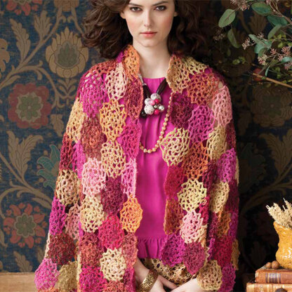 Noro 1321 Chrysanthemum Shawl is crocheted with Silk Garden Lite into circular motifs by starting each motif at a different point in the color sequence results in a distinct variety of colors. This lovely accessory is perfect to wear on cool summer nights and sunny autumn days. Silk Garden Lite is the yarn for you. This yarn will knit into beautiful garments compliments of Noro's hand-dyed process and self-striping. The motif is charted and written out.