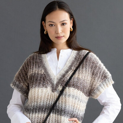 Noro Clove, designed by Laura Zukaite, is a fabulous relaxed v-neck women's vest with dropped shoulders in a brioche rib knit in Okunoshima. The lovely sweater is knit flat in pieces from the bottom up and then seamed. The neckband and armhole bands stitches are picked up along the edge and worked in the round. Noro Okunoshima is a lofty blend of silk, wool, angora, and mohair that mimics the look of handspun yarn. This single-ply yarn has cozy warmth and the gorgeous self-striping colors that we've come to expect from Noro.