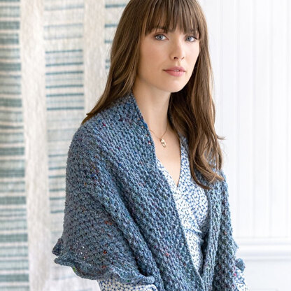 Noro Fillbert is a stunning shawl with a rich and sophisticated stitch pattern knit in Madara. The oversized rectangular wrap is finished with a dainty ruffle that edges three sides. The wrap is knit flat from the bottom up seamlessly, and then stitches for the ruffled edge are picked up along the three sides. Noro Madara is a sophisticated blend of wool, silk, and alpaca with an intriguing tweed texture. This worsted weight yarn has a tightly spun single-ply with colorful flecks spun in along its length. The textured pattern is in written form only.
