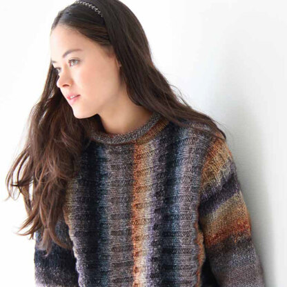 Noro Correa is a stunning women’s textured pullover knit in Silk Garden. The sweater has alternating stitch blocks creating attention-getting texture on the sideways-knit front and back with stockinette stitch sleeves and a relaxed rolled neckline. The luscious texture of silk and mohair combine in Noro Silk Garden. This exquisite worsted weight yarn is hand-dyed in Noro's signature glorious self striping color combinations and knits up into a superbly draped fabric with warmth to spare.