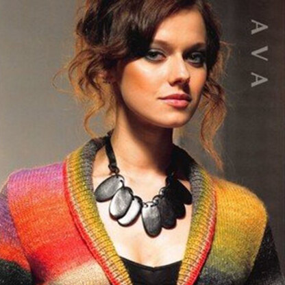 Ava, Jenny Watson’s fashionable cropped cardigan, features a shawl collar and a long section of ribbing at the cuffs and hem. This stylish garment is knit in Noro’s Silk Garden Lite, a DK weight silk, mohair, and wool blend yarn.