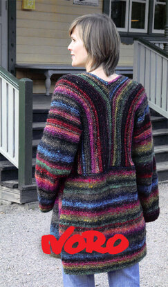 Jenny Watson’s Bettna is an open-front cardigan that features an unusual construction method. The sleeves and lower sections are knit traditionally, while the bodice is worked from side to side, creating an interesting stripe effect with Noro Silk Garden’s long color repeats.