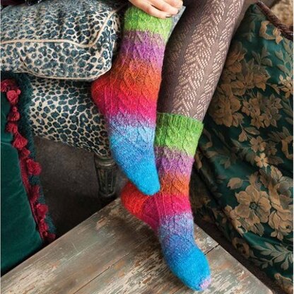 Knit from the cuff-down, these Faux Cable Socks from Noro utilize twisted