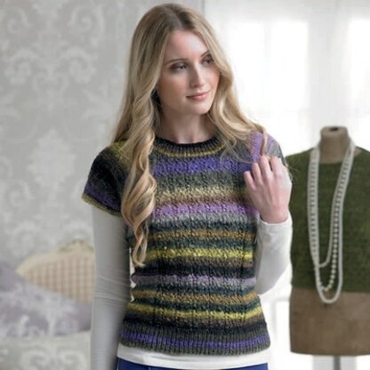 Noro Pearl is worked in light self-striping yarn Noro Silk Garden Sock. Pearl is a sweet little women’s top with lace panels and ribbed edges. This women’s pullover is knit flat in pieces and then seamed. Leave it to Noro to give you everything you love about Silk Garden in a fingering weight yarn.