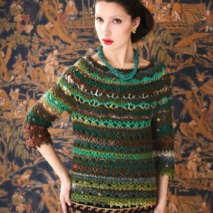 Crochet the Round Yoke Pullover Noro - a colorful, striped pullover with fascinating stitch pattern made out of Noro's Silk Garden Lite yarn. This pullover will adds brightness & character to your wardrobe. This sweater is worked from the neck down in rounds, which are then joined, turned, then worked back and forth. After the yoke is worked, the body and sleeves are worked down.