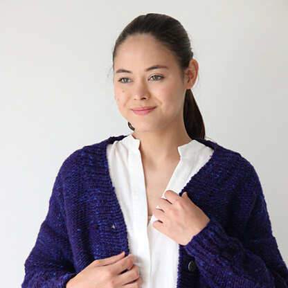 Noro Y1168 Cardigan is a lovely women’s V-neck sweater knit in Tsuido. The cardigan features a simple stockinette stitch, dropped shoulder, and long sleeves. This piece is knit flat in pieces from the bottom up and then seamed. Tsuido means tweed in Japanese, and this bulky weight yarn from Noro certainly lives up to its name! With a slightly thick and thin structure and colorful bits of unspun roving added to its single ply.