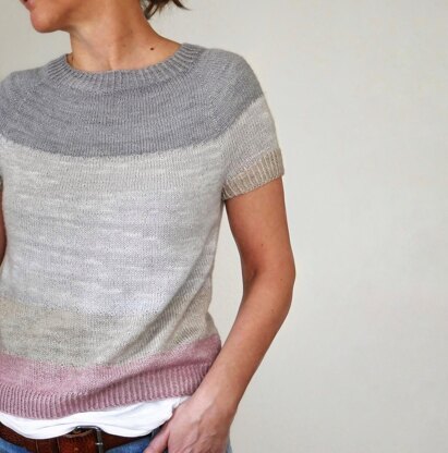 The sweater is worked seamlessly in rounds in one piece from the top-down. After the collar is worked, the yoke is shaped by increases for body and sleeves and additional radial increases up to the sleeve separation. The sleeve stitches are then placed on hold, underarm stitches are cast on, and you continue to work the body with some color blocking to the bottom ribbing. After the body is completed, sleeve stitches are placed back on the needles to work the ribbing in the round.